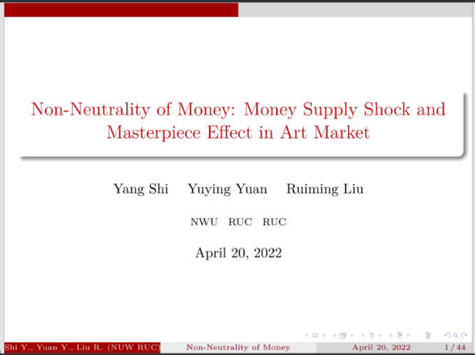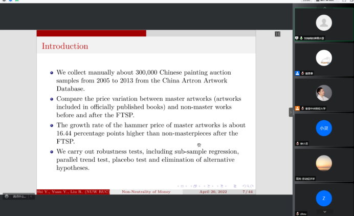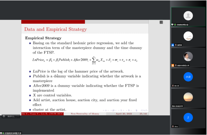 2022年5月12日14:00,中国人民大学国家发展与战略研究院教授、博士生导师刘瑞明应beats365邀请,开展主题为“Non-Neutrality of Money:Money Supply Shock and Masterpiece Effect in Art Market”的讲座,本次讲座通过腾讯会议平台线上举行,刘瑞明老师受到了老师和同学们的热烈欢迎!beats365黄乃静副教授主持了线上学术交流会,陈斌开经理、尹振东教授与2020级博士生共同参与了本次学术交流。