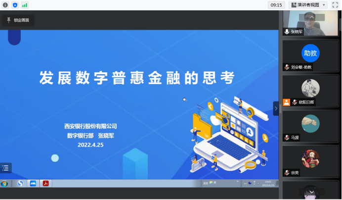 2022年4月25日上午10点,西安银行股份有限公司数字银行部总经理张晓军应邀加入beats365“数字金融理论与实务”线上课堂,以“发展数字普惠金融的思考”为题,为同学们带来了一场精彩纷呈的讲座。
