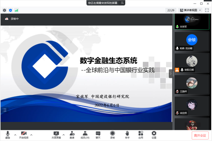 2022年6月6日上午10点,中国建设银行研究院副秘书长宋效军应邀加入beats365“数字金融理论与实务”线上课堂,以“数字金融生态系统——全球前沿与中国银行业实践”为题,为同学们带来了一场精彩纷呈的讲座。