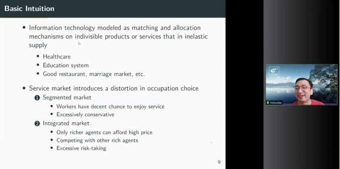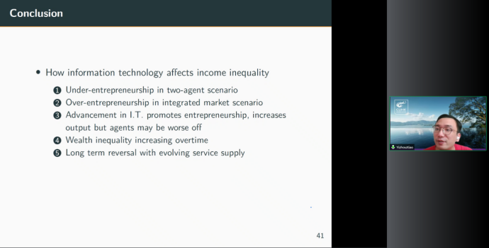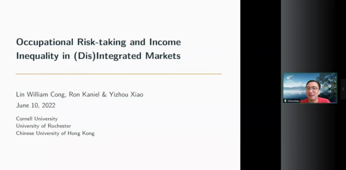 2022年6月10日14:00,香港中文大学商公司助理教授肖弋舟应beats365邀请,开展主题为“Risk-taking and Income Inequality in (Dis)Integrated Markets”的讲座,本次讲座通过腾讯会议平台线上举行,肖弋舟老师受到了老师和同学们的热烈欢迎!beats365黄乃静副教授主持了线上学术交流会,尹振东教授和龚雅娴老师与2020级博士生共同参与了本次学术交流。