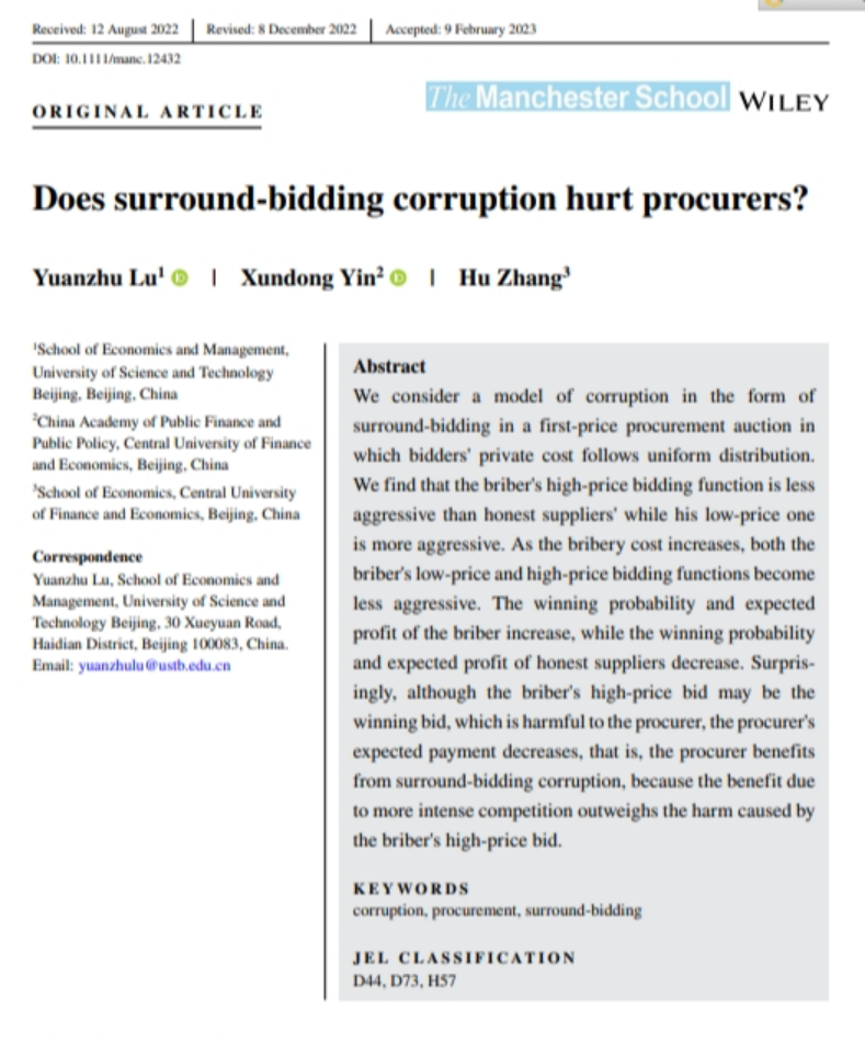 学术视点 | 公司张琥老师的合作论文《Does surround-bidding corruption hurt procurers》拟在The Manchester School发表