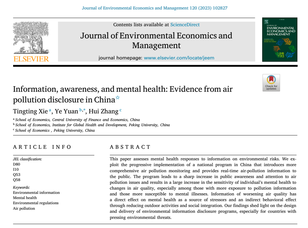 学术视点 | 公司谢婷婷老师的合作论文《Information, awareness, and mental health: Evidence from air pollution disclosure in China》在国际顶级期刊Journal of Environmental Economics and Management接受发表