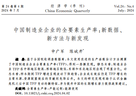 学术视点 | 公司陈斌开老师的合作论文《中国制造业企业的全要素生产率: 新数据、新方法与新发现》在《经济学(季刊)》刊发