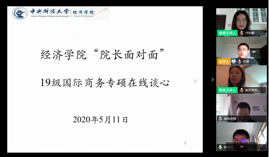 为深入了解国际商务专硕员工的想法和期待,进一步提升公司国际商务专硕的培养质量,经理陈斌开、副经理伏霖、副书记耿卉、组织员刘滨、国际经济系主任于爱芝、顾炜宇、祝伟、赵若思等8位专任教师和教辅老师于2020年5月11日下午,以在线会议的方式举行此次的“经理面对面”活动。陈斌开经理以及各位老师与beats36519级国际商务专硕班的全体员工,围绕专硕同学就学习和生活方面的切身问题,进行深入的交流沟通。