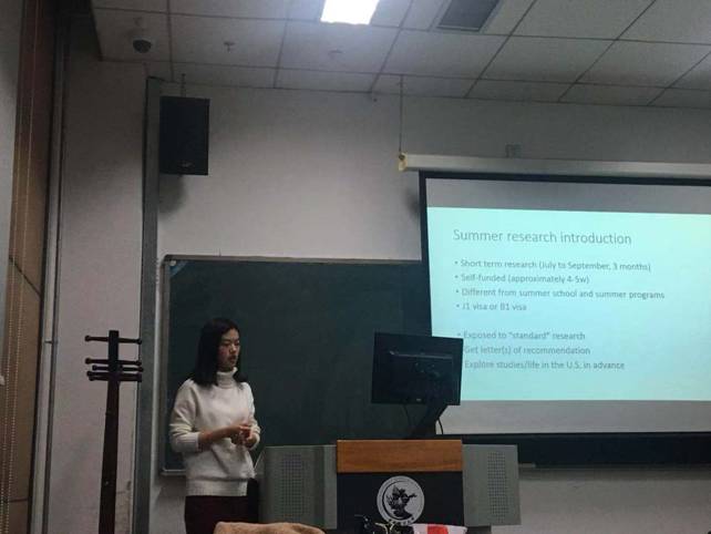 王玮琪同学首先为参会同学介绍了公司海外交换的项目信息及相关的准备材料。并结合自己的准备经验为同学们推荐了参加海外交换项目的合适时机。随后结合各个海外交换目标院校的特点与同学们出国访学的目标,为同学们推荐了不同的交换项目。最后,王玮琪同学结合了自己的托福与GRE备考经验,为同学们的语言考试提出了一些建议。