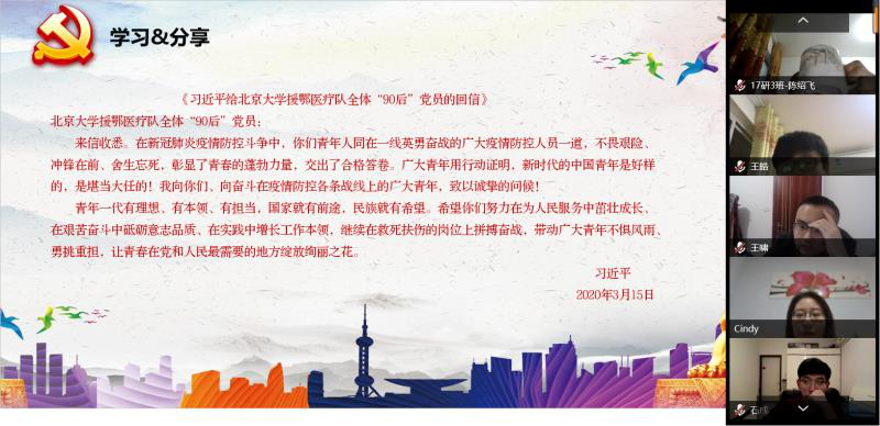 2017级硕士生第一、二、三党支部联合开展“爱国驻我心、抗疫勇担当”线上主题党日活动,活动重点围绕《习近平给北京大学援鄂医疗队全体90后党员的回信》开展学习,同时就人民日报评论文章《努力在为人民服务中茁壮成长》进行深入解读。