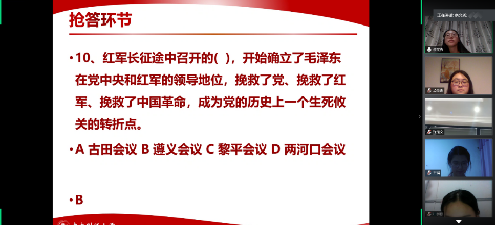 为庆祝中国共产党成立99周年、迎接七一建党节,2020年6月29日晚上,2018级硕士生第二党支部开展“初心不忘、献礼七一”线上主题活动。本次活动分为主题党课、红色经典配音比赛和党史知识竞答三个环节,旨在回顾中国共产党建党历程、追溯党和国家砥砺奋进之路、牢记共产党人的初心使命。本次活动由党支部书记余文秀主持,党支部全体党员、预备党员和发展对象参与了此次活动。