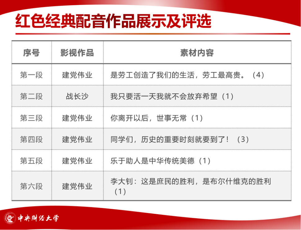 接着,在红色经典配音比赛环节,主持人依次播放由每名党员事先录制好的配音片段,每名党员选出心中最佳的三个配音作品,最后评选出前三甲。党员们表示通过亲自参与红色经典配音,自己更加切身体会到党的发展历史中的伟大时刻,为共产党人的雄心壮志所感染。