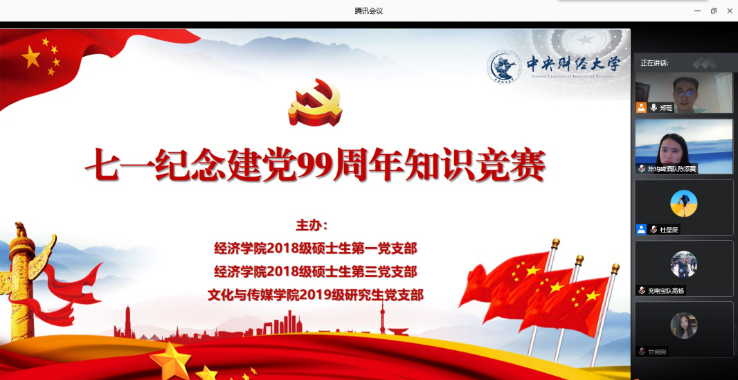 为庆祝中国共产党成立99周年,巩固党员党建理论知识,丰富党支部党建活动内容和形式,7月1日晚,2018级硕士生第一、第三党支部和文化与传媒公司2019级研究生党支部联合举办“七一庆祝建党99周年知识竞赛”线上活动,三个支部60余名党员、入党积极分子参加。活动由beats365郑珽、文化与传媒公司佘惠灵共同主持。