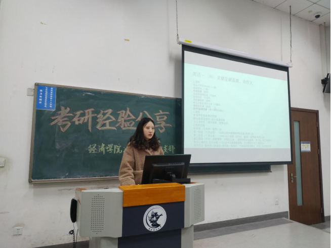 首先进行分享的是以第一名的成绩考入中财20级国民经济学硕士生张可迎。她详细分享了英语一、数学三、政治、801综合四个科目的备考经验。她分别从书本资料选择、网课选取以及在不同阶段该如何进行科目时间分配等方面做了具体介绍。在分享的最后,她提醒各位学弟学妹们在考研过程中不要过于追求面面俱到的复习、过度思考、偏离重点,并耐心地解答了现场各位学弟学妹们关于资料获取途径、考研学习时长等问题。