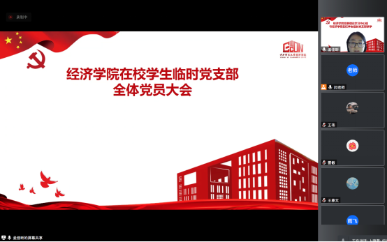临时党支部党建指导员、党务秘书闫宁希望支部成员能够团结一心,聚成火焰,尽己所能发光发热,在疫情防控关键期,为师生、为公司、为社会作出贡献,在温暖自身的同时彰显青年党员的风貌;临时党支部书记、21级博士研究生孟佳昕提出,在这样一个特殊时期本硕博三个阶段的党员员工相聚并成立临时党支部是非常难得且具有特殊意义的,表示会带领支部成员亮明身份,主动担当,有所作为,服从命令听指挥,充分发挥支部战斗堡垒和党员模范带头作用;宣传委员19级硕士研究生卜晓蕾表示自己以及部分支部成员即将毕业,在校园的最后一段时间,要做好服务工作,最大程度办实事,站好最后一班岗;组织委员18级本科生郭雨飞表示会和在校生多加沟通和交流,同心同向,携手共进为公司师生排忧解难。支部成员依次进行自我介绍并对支部接下来的工作内容以及在校期间学习生活的实际情况进行充分交流讨论。党员发言踊跃,表态积极,表示要用实际行动书写共产党员的责任与担当,用周到细致的工作展现经院学子凝心聚力、勇于担当的青春风貌,为师生、公司做好服务保障、为公司疫情防控作出应有贡献。