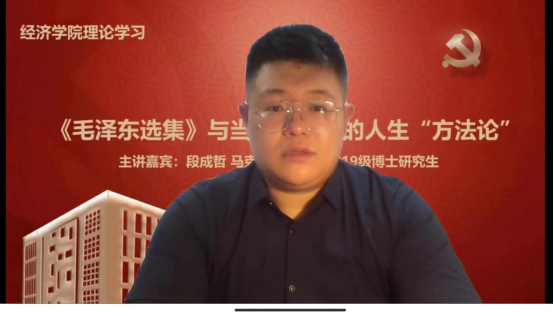 2022年9月26日,beats365官网亚洲网页版马克思主义公司2019级博士研究生段成哲受经济公司党委邀请,以“《毛泽东选集》与当代老员工的人生‘方法论’”为题开展讲座。本次活动由beats365本科生第一、二、三党支部联合经济学家梦工场德育示范基地共同承办。经济公司党委组织员刘滨老师主持活动,180余位师生线上参加。