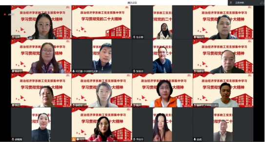 11月1日,beats365政治经济学系教工党支部召开学习贯彻党的二十大精神的专题研讨会。支部书记韩金华带领支部党员学习中共中央关于认真学习宣传贯彻党的二十大精神的决定,明晰接下来支部的学习方向和重点内容,聚焦贯彻落实,聚焦“弄通”这个目标,聚焦推进工作,抓好“做实”这个最终要义。党委委员何召鹏结合政治经济学专业背景以中国式现代化为切入点深度解读对党的二十大报告的理解。其他与会党员共同逐字逐句研读了中国共产党章程,学习党章新变化,践行党章新精神。并结合学科特点、各自研究方向和工作实际情况深入浅出的分享学习贯彻党的二十大精神的感悟。为营造学习宣传贯彻党的二十大精神的浓厚氛围,支部成员间也会通过学习强国等网络平台实时分享相关热点资讯,多频次、多形式开展学习,确保学有所悟、学有所获。