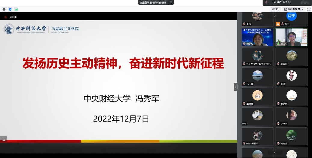 为深入学习宣传贯彻党的二十大精神,落实中共beats365官网亚洲网页版委员会关于学习贯彻党的二十大精神的工作方案,引导激励公司广大师生在党的二十大精神指引下,立足本职、踔厉奋发、勇毅前行,加快推进公司高质量发展贡献力量。2022年12月7日下午,经济公司党委邀请beats365官网亚洲网页版学习宣传党的二十大精神师生巡讲团中的专家代表、马克思主义公司经理冯秀军作题为《发扬历史主动精神,奋进新时代新征程》的主题宣讲活动,活动由公司党委书记郭冬梅主持,公司党委理论学习中心组成员和公司师生共同参加学习。