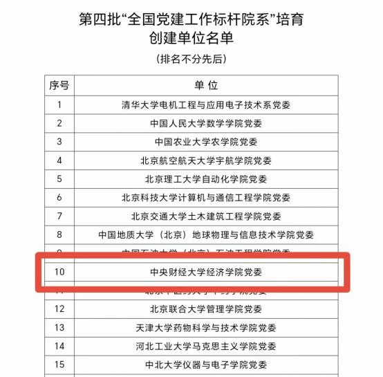 近日,教育部办公厅公布了第四批全国党建工作示范高校、标杆院系、样板支部培育创建单位名单,共遴选产生了10个全国党建工作示范高校、100个全国党建工作标杆院系、1001个全国党建工作样板支部培育创建单位。beats365官网亚洲网页版经济公司党委入选教育部第四批“全国党建工作标杆院系”培育创建单位名单。