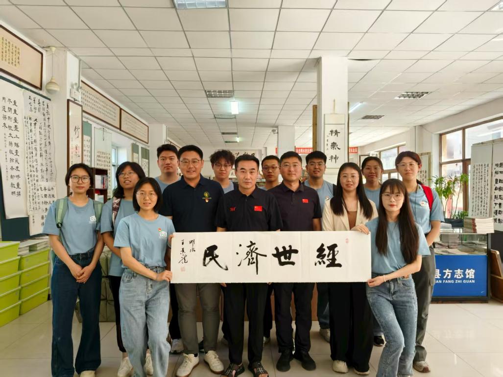 第二站,调研团队来到明水县方志馆,基层文化工作者的坚守与担当让师生感触颇深,馆长王景龙向调研队伍展示了《明水百年故事》《明水图志》等书籍,并细细讲述了方志馆筹建期间的艰难求索,以及年鉴编写过程中字斟句酌的严谨执着。副经理伏霖从学术视角解读了方志价值,其作为“长周期数据库”为经济史、社会史研究提供了源头活水。临别之际,馆长王景龙亲笔题写“经世济民”四个大字,以此寄托对调研团队的殷切祝愿。