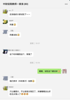 随后,为确保公平并进一步充分动员教职工的积极性,公司分工会在“中财经院教师一家亲”微信群中发起投票。投票规则要求每位老师对自己心仪的菜品投票,最多投10票,并将按照票数高低决定一、二、三等奖。投票一开始,引起了公司老师们的强烈兴趣,老师们展开了热烈的讨论,纷纷表示每道菜品都很美味,期待下次开展线下试吃品鉴会。