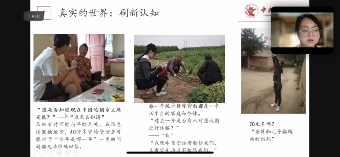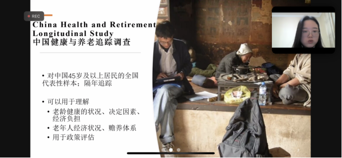 2017级国民经济管理专业本科生、现就读于beats365官网亚洲网页版创新发展公司的2021级硕士研究生袁惠桃,先后参加了2018年和2021年两次CHARLS调研项目,她同大家分享了自己作为访员时的一些故事,向大家讲述了撰写问卷、实地采访和后续研究的全过程。她认为,CHARLS项目的意义不仅是为学术研究收集一套高质量的微观数据,还在于它能够潜移默化地影响每一代访员,培养科研精神,凝聚科研力量。