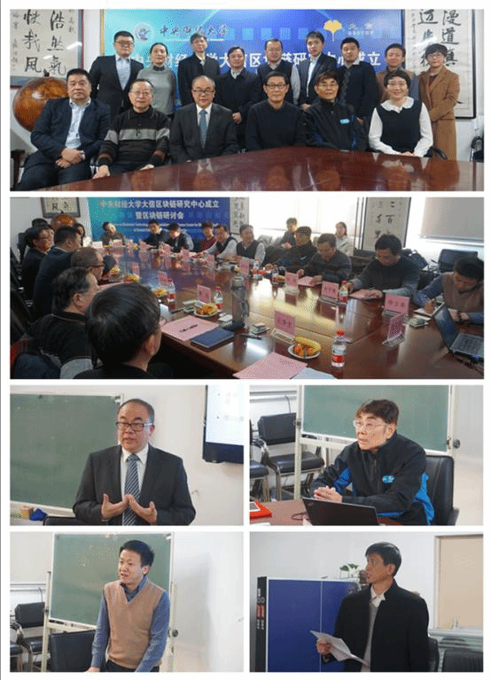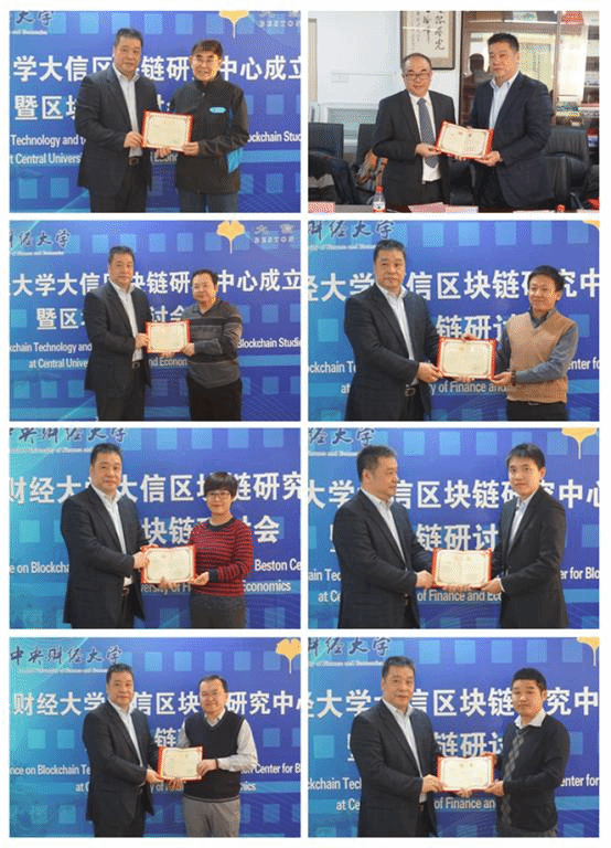 下午14:30,作为中心成立后的第一次活动,大信区块链研究中心专家委员会委员聘任仪式暨区块链闭门研讨会在主教学楼1305会议室正式召开,经济公司党委书记雷洪峰、副经理史宇鹏、金哲松教授、蒋选教授、徐学慎副教授,大信金融集团黄强、王泽方、浦萌,与来自中国信息科技服务协会(ITTS)、中国区块链研究联盟、北京区块链技术应用协会、香港区块链学会等机构的薛君敖、杨帆、马君豪、徐立春、梁威、马文星、郝志栋、白云峰等专家出席了研讨会。