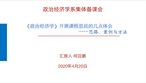 随后,何召鹏老师从《政治经济学》开展课程思政的思路及具体方法两个维度重点汇报了如何在《政治经济学》课程教学中开展思政教育。他指出,课程思政的关键是专业课程中,加入思政素材、实现“知识传授”和“价值引领”有机统一。最大程度发挥课程思政育人效果的关键是实现专业课程与思政元素的有机融合,包括思政元素与专业基础理论的有机融合、与专业热点问题的有机融合以及与员工专业兴趣的有机融合,最终实现专业课程教学与思政教育相互促进。在两者的良性互动中,提升当代老员工对中国特色社会主义的认同感和参与度,培养合格的社会主义建设者和接班人。