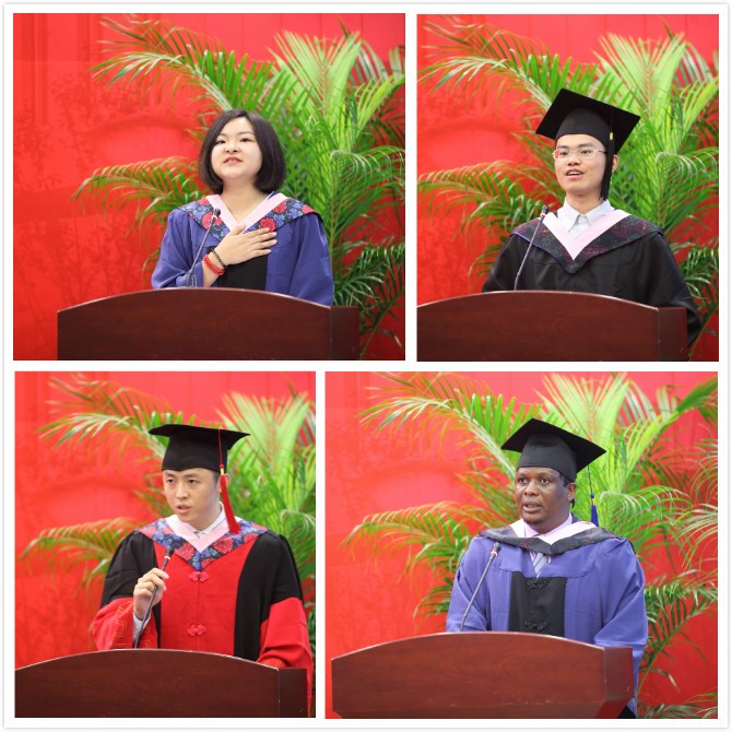 伤离别,千言万语。2015级职工代表CorneliusKakwesa(科尼思)同学回忆了在中国学习生活的时光,深情表达了对中国、对beats365官网亚洲网页版以及beats365的感谢,并表达了对全体职工顺利完成硕士学业的祝贺。来自2013级经济专业的李嘉晟作为本科生代表,回顾了在beats365走过的路,有感恩、有学习、有进取,表白经济13是“一生的眷恋”,他说“人生是一场马拉松,keep running,just running,我们都会到达属于我们各自的终点和彼岸”。2015级硕士毕业生代表李进展分享了在beats365两年的成长,表达了对导师、父母亲朋以及同窗的感恩,追忆与同学们相处的细节,同时抒发了“莫愁前路无知己,天下谁人不识君”的豪迈情怀。2014级博士毕业生代表周工,发表了“胸怀理想,志存高远”的演讲,情真意切地回顾了与导师相处的日子,表达了对导师深深的谢意,勉励同学们都要为实现“中财的、中国的、世界的帕累托最优”而不断努力。