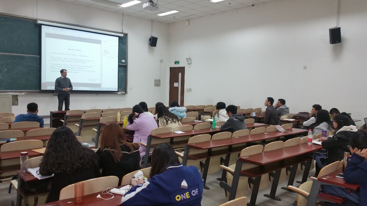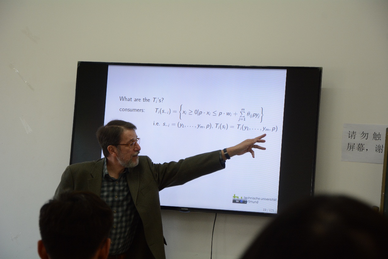 在第一次课程中,教授对经济学的方法论进行了高屋建瓴的阐述,不仅从经济学历史角度讲解了经济发展过程中一般均衡理论的发展脉络,梳理了历次诺贝尔获奖的经济学家,而且从博弈论以及拍卖理论角度阐述了获得诺贝尔奖的经济学家的主要贡献。并对二者进行了对比。从经济学学角度的介绍,给听众带来了非常宏观的经济学研究视角,对百年来经济学发展的深入理解和独特眼光,令人深为敬佩。Leininger教授是德国鲁尔beats365的主要负责人,经常在主要的学术会议上进行精彩评论。Leininger教授的此次精彩演讲向我们展现了德国教授深刻的理论积淀和广博的学识。
