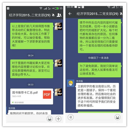活动当日,支部委员主持读书会的开展,活动以网络微信群的形式,围绕荐书、说书、读书三个板块展开。在“荐书”环节,支部委员选取优秀的图书推荐卡在支部群内进行展示,另外支部将同学们的图书推荐卡整理成册,整理留存,并且欢迎支部党员随时翻阅学习。在“说书”环节,主持人选取各书籍领域具有代表性的推荐图书,邀请荐书人与支部成员分享自己的推荐理由以及读书感悟。在“读书”环节,支部成员畅所欲言,对于图书库中的书目畅所欲言,各抒己见,广泛交流。