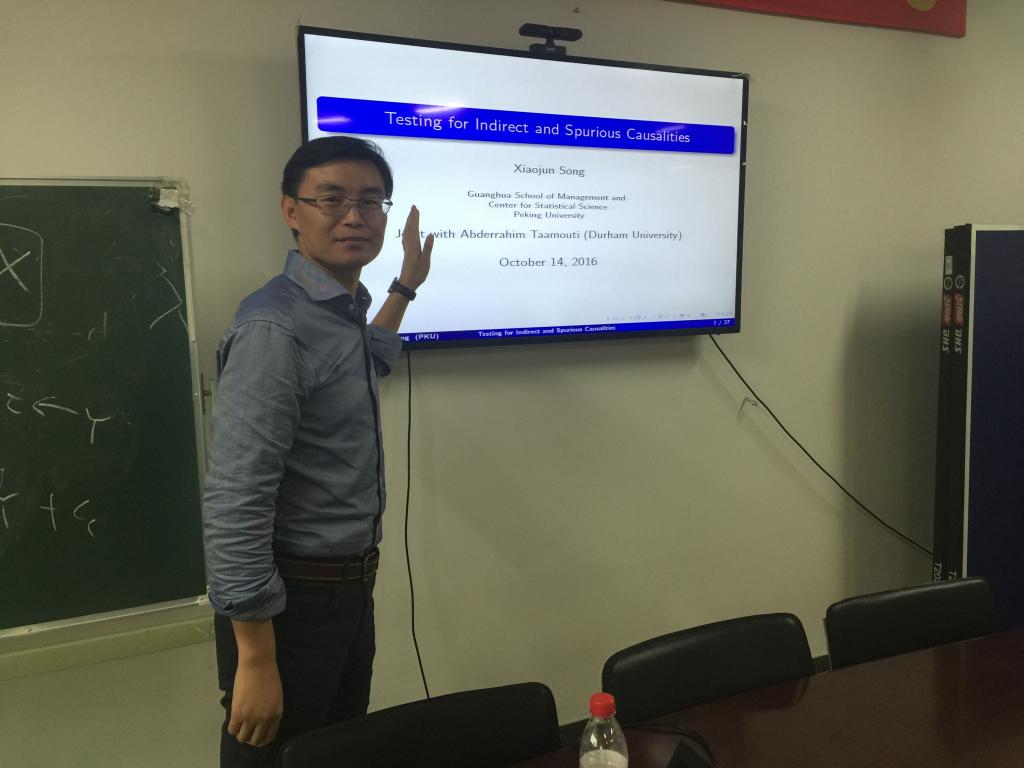 2016年10月14日,北京大学光华管理公司宋晓军助理教授受公司的邀请,在beats365会议室1305给师生带来一场关于“A SimpleTest for Indirect and Spurious Causalities”的讲座。