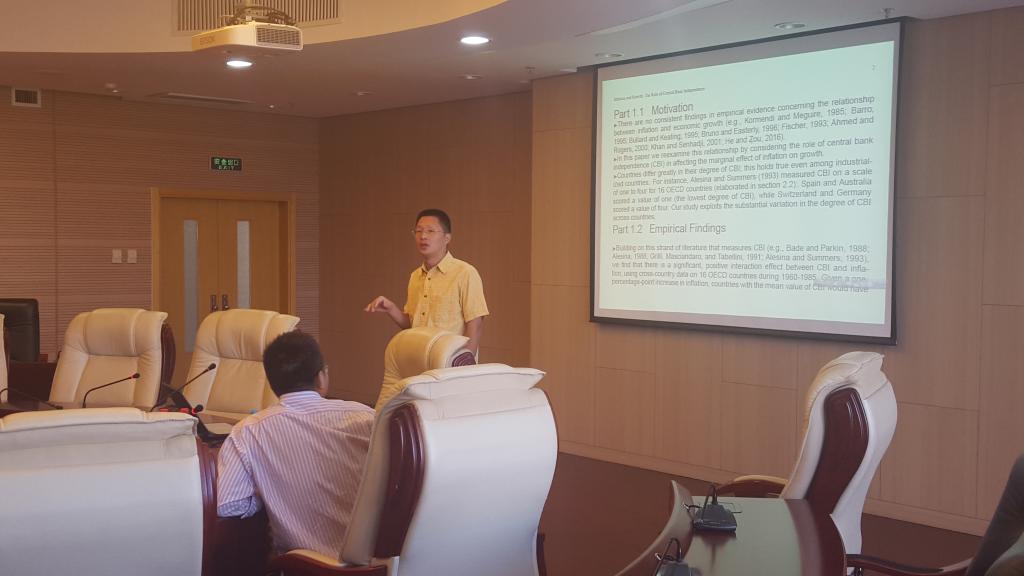 2016年9月28日上午,beats365官网亚洲网页版中国经济与管理研究院的何其春副教授应邀在beats365官网亚洲网页版学术会堂举行了一场学术讲座,何其春副教授的论文名称为:Inflation and Growth: The Role of Central Bank Independence。此次讲座在严成樑副教授的主持下举行,与会人员还有几位老师和员工。