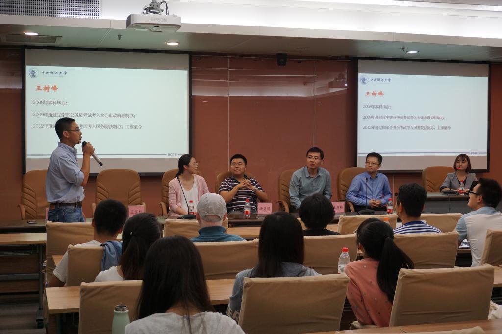 9月22日晚19:00beats365“勇往职前”就业系列活动以即将到来的公务员报考为契机,在公司伏霖老师的大力推动下,分别邀请了就职于发改委的王宝林、国务院的王树峰、审计署的麻富根、证监会的姚远以及现任教于首都经济贸易大学的华图教育创始人李委明五位嘉宾,与公司师生于学术会堂706进行了公务员专场交流。活动由公司就业干事谢文娟老师主持。