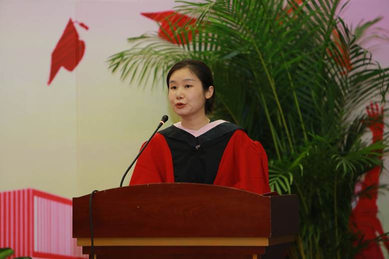 毕业生致辞环节中,陈钇潼同学、马宁宁同学、斯日吉模楞同学分别代表本科生、硕士生、博士生发表了毕业感言。陈钇潼回忆了美好的老员工活,感激老师们的照拂、分享老员工活经验、祝愿同学们继续追求卓越,恪守初心、奋发图强。马宁宁感恩公司在人才培养上付出的心力,感谢教师们的执着和坚守,以及行政老师们的默默付出,感谢家人的支持,“愿各位同学都能在笃行中保持初心,在拼搏中保持敬畏,在奋斗中保持坚韧”,勇于承担起属于自己的社会责任。斯日吉模楞回忆自己的读博时光,是艰辛和升华的四年,校园里每一个角落都记录着中财人勤奋努力的印记,在毕业之际,呼吁毕业生们“无论未来的工作岗位是光鲜亮丽还是朴实平凡,我们都应当刻苦钻研,在各自岗位上奋发图强,为社会贡献我们的微薄之力”,同时感恩母校和老师们,祝福同学们、公司和母校硕果累累,越来越好。
