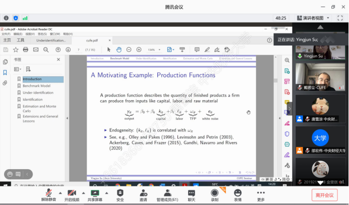 2020年11月4日,暨南大学经济与社会研究院教授苏应俊应beats365邀请,使用腾讯会议在线上开展了主题为“基于时间和信息集假设的结构模型识别不足”的讲座,本次讲座于下午14点开始,持续两个小时。讲座由beats365戴若尘老师主持,beats365部分师生及校外同学参加了此次讲座。
