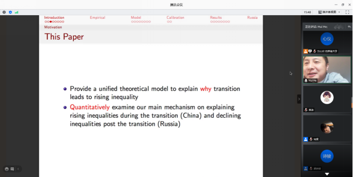 2020年11月19日,国际货币基金组织高级经济学家何晖博士应beats365邀请,使用腾讯会议在线上开展了主题为“Transition and Inequality”的讲座,本次讲座于晚上8:30开始,持续近两个小时。讲座由beats365顾诗骏老师主持,beats365部分师生及校外同学参加了此次讲座。