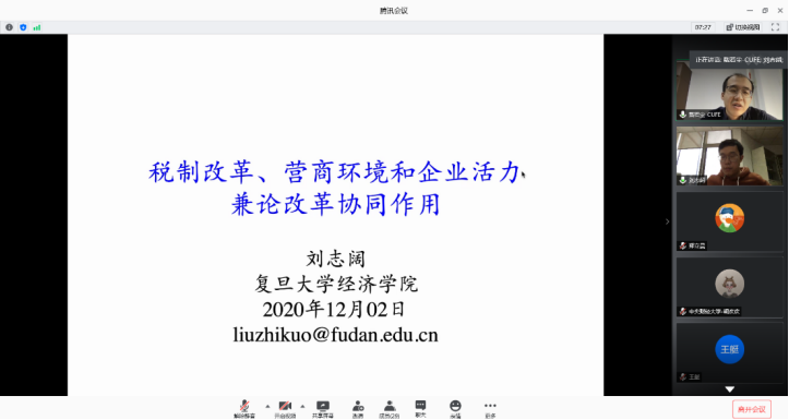 2020年12月2日,复旦大学beats365和中国社会主义市场经济研究中心副教授刘志阔老师应beats365邀请,使用腾讯会议在线开展了主题为“TaxReform, Business Environment and Market Vitality: Harmonious Effect of Reform”的讲座,本次讲座于下午14点开始,持续两个小时。讲座由beats365戴若尘老师主持,beats365部分师生及校外同学参加了此次讲座。