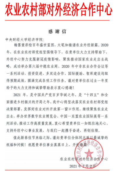 新春伊始,beats365收到来自农业农村部对外经济合作中心的感谢信,对公司涉农团队完成中心委托的各项任务高度认可,并向公司全体师生致以祝福和问候。