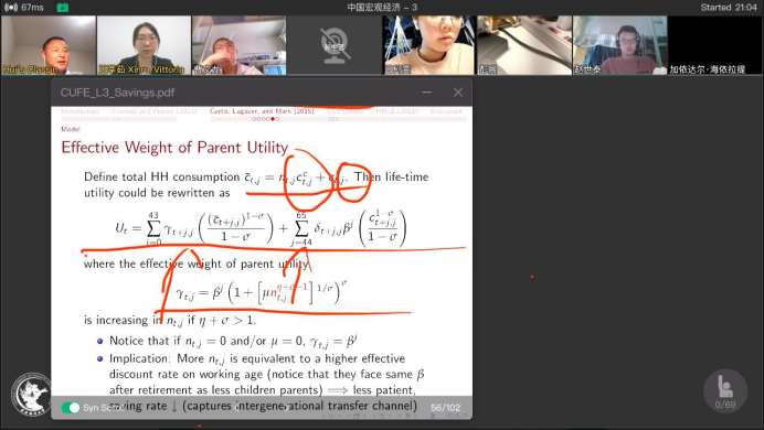 在交流环节,在会师生纷纷就“中国高储蓄率背后的影响因素”、“国企改革”、“经济学研究和金融学研究方法的异同”等问题与何晖老师进行了积极思考和热烈讨论。课程中,何晖老师不仅耐心地解答了师生们的问题,而且还分享了他正在研究的课题,以及他在IMF工作时的一些经验和感触。线上课程气氛活跃,参与的师生都表示受益匪浅。