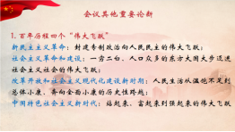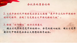 除“第三个决议”外,本次会议还提出了其他重要论断:一是会议提出百年历程四个“伟大飞跃”;二是习近平新时代中国特色社会主义思想“是中华文化和中国精神的时代精华,实现了马克思主义中国化新的飞跃”;三是强调了“两个确立”的决定性意义。