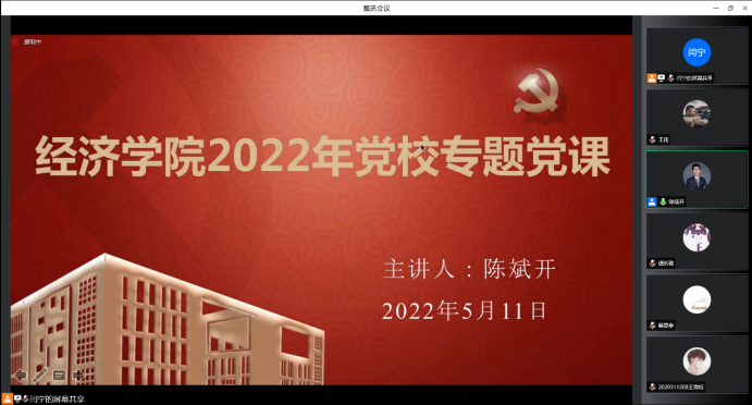 他提到,历史赋予使命,时代要求担当,中华民族伟大复兴是需要靠一代又一代人的接续奋斗。在民族复兴的道路中,不乏知识分子的责任与担当,他们立时代潮头、通古今变化、发思想先声,为中华民族伟大复兴贡献了巨大的智慧与力量。而后,他讲述了改革开放所创造的中国经济发展奇迹,当前中国经济面临的国际国内形势,以及我们这一代人面临的挑战与责任。他指出同学们享受到了改革开放带来的巨大红利,是这个时代的重要见证者,而当前中国正面临百年未有之大变局,国际环境错综复杂,同学们作为新一代知识分子在国家未来发展中,要秉承经世济民的家国情怀,拥有开阔的心胸和格局,不断提高自身素质,不畏各种艰难险阻,努力做中华民族伟大复兴的实干家与建设者,践行对党的忠实承诺。