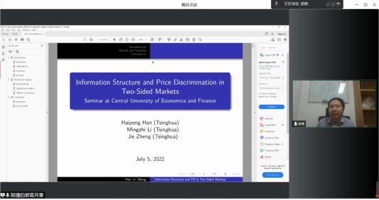 2022年7月5日清华大学经济管理公司副教授郑捷应beats365邀请,开展主题为“Information Acquisition and Price Discrimination in Two-sided Duopoly Markets”的讲座,本次讲座于下午2点在线上的腾讯会议举行,持续近两个小时。beats365尹振东教授主持了此次线上讲座,史宇鹏教授、洪圣杰副教授、龚雅娴副教授和吴楠老师与员工们共同参与了本次讲座。