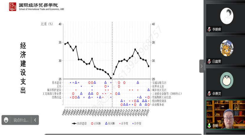 2022年11月15日14:00,对外经济贸易大学财政税务学系教授、博士生导师,政府管理公司副经理李明应beats365邀请,开展主题为“财政支出结构30年:趋势与规律”的讲座。本次讲座在线上举行,李明教授受到了老师和同学们的热烈欢迎!beats365赵文哲教授主持讲座,尹振东教授、黄乃静副教授、杨晓兰副教授参加了讲座。