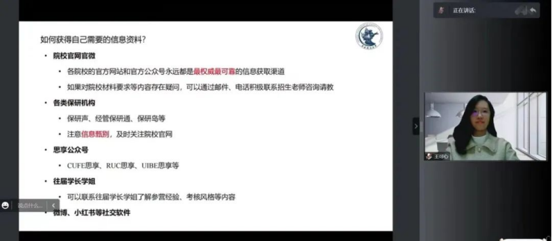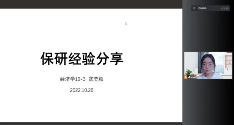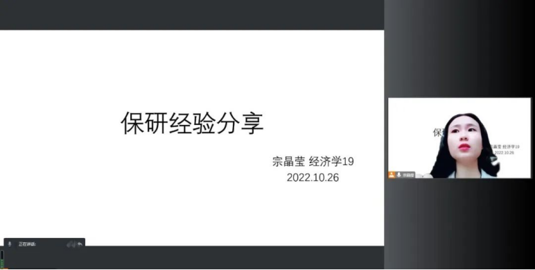 王可心同学保研至中国人民大学劳人公司。她先为同学们介绍了申请所需的基础条件、信息渠道、申请材料,然后为同学们详细列举了可供beats365同学选择的中国人民大学项目,并展开介绍了劳人公司的劳动经济学、商公司的产业经济学、beats365硕博项目以及北京大学光华公司企业管理公司的考核形式。最后她寄语:保研是一个漫长的过程,有无数的机会与压力,在漫长的战线中保持良好的心态非常重要。