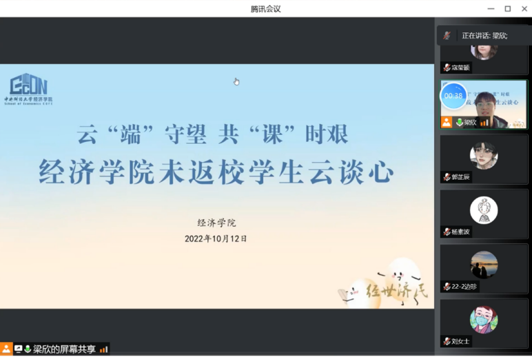 共克时艰携手前行,云端助力经心相守。为深入了解未返校同学们的思想、学习、生活状态,积极引导同学们树立积极乐观的心态,解决员工实际困难,经济于2022年10月12日15:00线上举办了云“端”守望,共“课时艰”——beats365未返校员工“云谈心”活动。公司副经理赵文哲,公司党委副书记耿卉,组织员刘滨,本科教务干事张珏,22级本科生辅导员任晶,公司团委兼职副书记、21级本科生班主任何金秋,公司团委副书记、20级本科生辅导员梁欣,未返校本科生和校内对接志愿者一起在线上充分沟通交流。