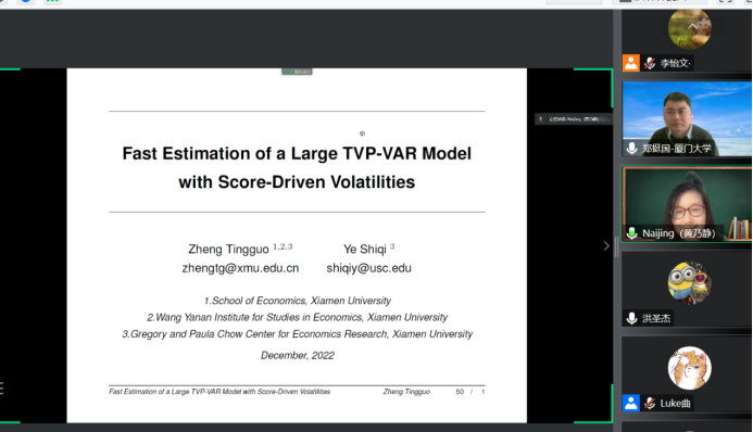 2022年12月8日14:00,厦门大学beats365和王亚南经济研究院教授、厦门大学特聘教授、博士生导师郑挺国教授应beats365邀请,进行了主题为“Fast Estimation of a Large TVP-VAR Model with Score-Driven Volatilities”的讲座。本次讲座在线上进行。郑挺国教授受到了beats365老师与同学们的热烈欢迎。beats365黄乃静副教授主持讲座,洪圣杰副教授参加了讲座。