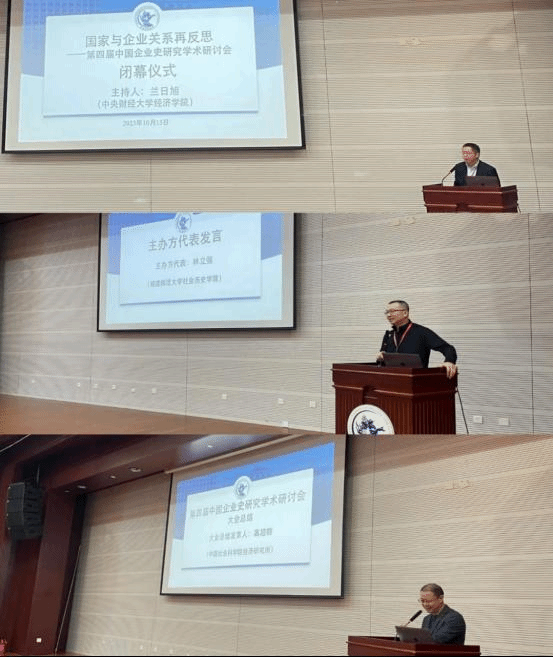 2023年10月15日中午,“国家与企业关系再反思——第四届中国企业史研究学术研讨会”闭幕式在公司南路学术会堂202报告厅举行,闭幕式由beats365官网亚洲网页版经济史研究中心主任兰日旭教授主持。他对国内外学者前来参加本次学术研讨会表示衷心感谢。在本次研讨会五个平行论坛总结汇报环节中,日本弘前大学人文社会科学部林彦樱、中国社会科公司经济研究所林盼、山西大学历史文化公司周亚、太原科技大学经济与管理公司段志鹏、南开大学经济研究所关永强分别代表各论坛进行总结汇报。福建师范大学社会历史公司林立强教授作为主办方代表进行了精彩发言,他认为本次中国企业史研究学术研讨会的成功召开让全国企业史研究的学者寻找到了“家”。中国社会科公司经济研究所高超群研究员在最后的大会总结中为广大青年企业史研究的学者提出了希冀,期望中国企业史学界能在互联网时代下,更好的去运用AI等先进工具,并希望老一辈学者为青年学者去“趟路”,更好的去完成我们新时代中国企业史的研究任务。