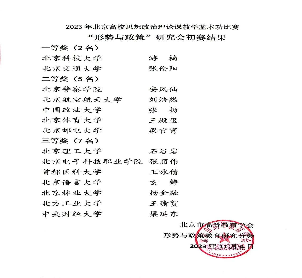 为深入学习、宣传和阐释党的创新理论,坚持不懈用习近平新时代中国特色社会主义思想铸魂育人,不断提升北京高校思想政治理论课的教学质量与水平,第十三届北京高校思想政治理论课教学基本功比赛“形势与政策”课预赛,于2023年11月4日在北京交通大学向阳办公区教师发展中心成功举办。公司梁延东老师获得第十三届北京高校思想政治理论课教学基本功比赛“形势与政策”课预赛三等奖。