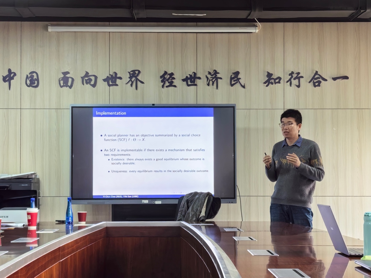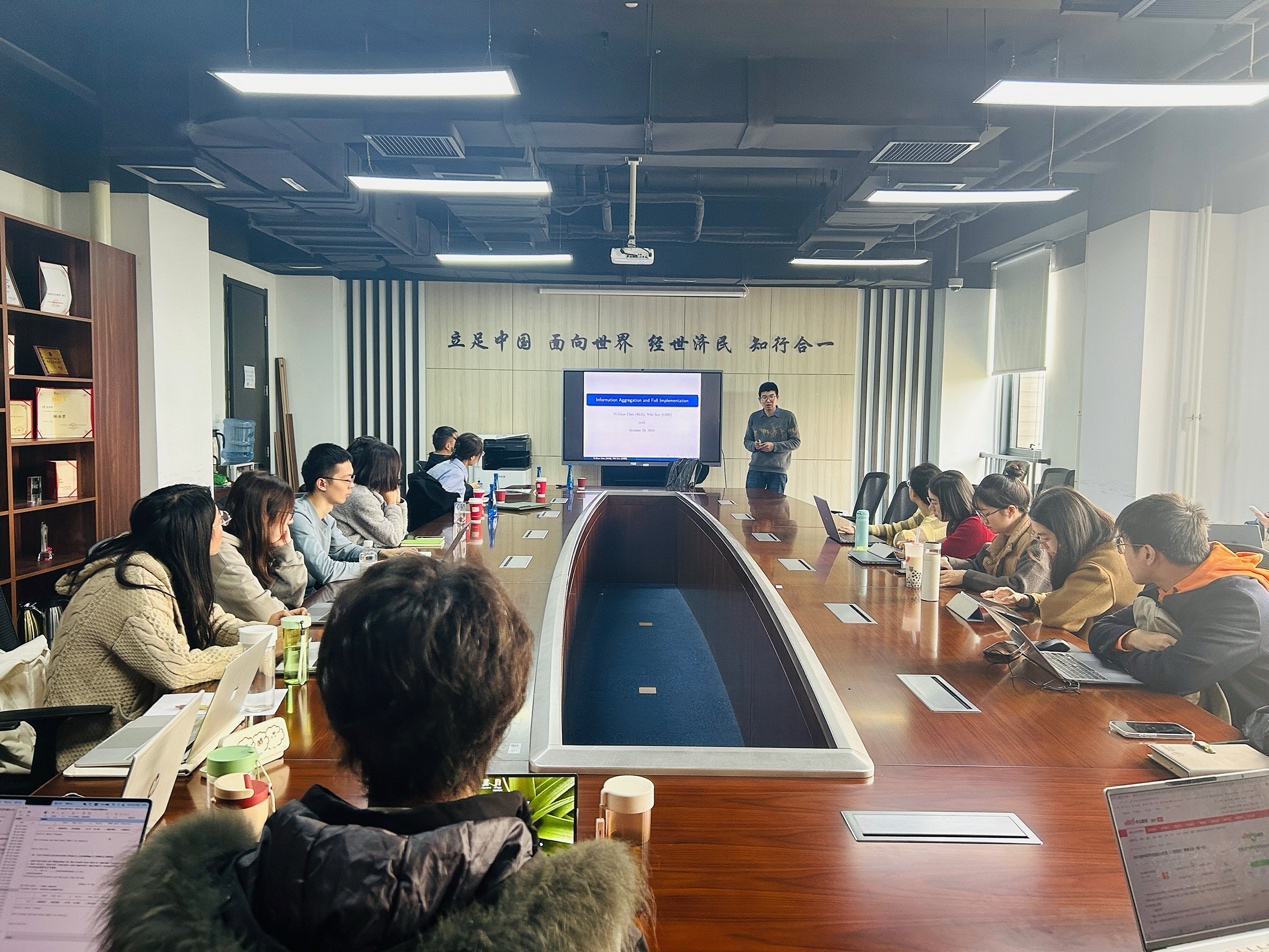 2024年10月25日下午,对外经济贸易大学经济学系孙一飞教授应邀为公司师生主讲“Full Implementation and Information Aggregation”讲座,讲座于公司楼11号楼308会议室举行。beats365龚雅娴副教授主持讲座,张志祥、李东阳等多位校内老师和三十余名同学参加了此次讲座。