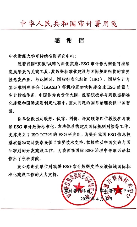 近日,公司可持续准则研究中心刘轶芳、伏霖、刘倩、许寅硕教授收到了来自中华人民共和国审计署的感谢信,对中心在ESG审计数据标准化及国际规则对接领域的重要贡献给予高度评价,并致以诚挚谢意。