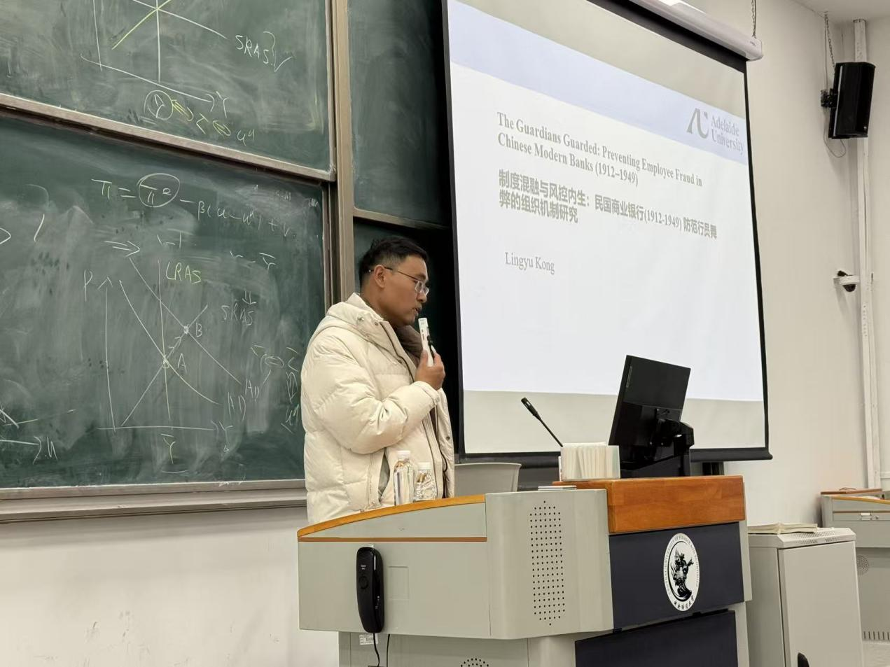 孔令宇副教授的研究方向涉及企业史、民国银行发展、社会网络分析等领域,相关研究成果发表于国内外知名期刊,如Business History (SSCI)、Asia-Pacific Economic History Review (SSCI)等。讲座围绕《制度混融与风控内生:民国商业银行(1912-1949)防范行员舞弊的组织机制研究》这一主题展开。