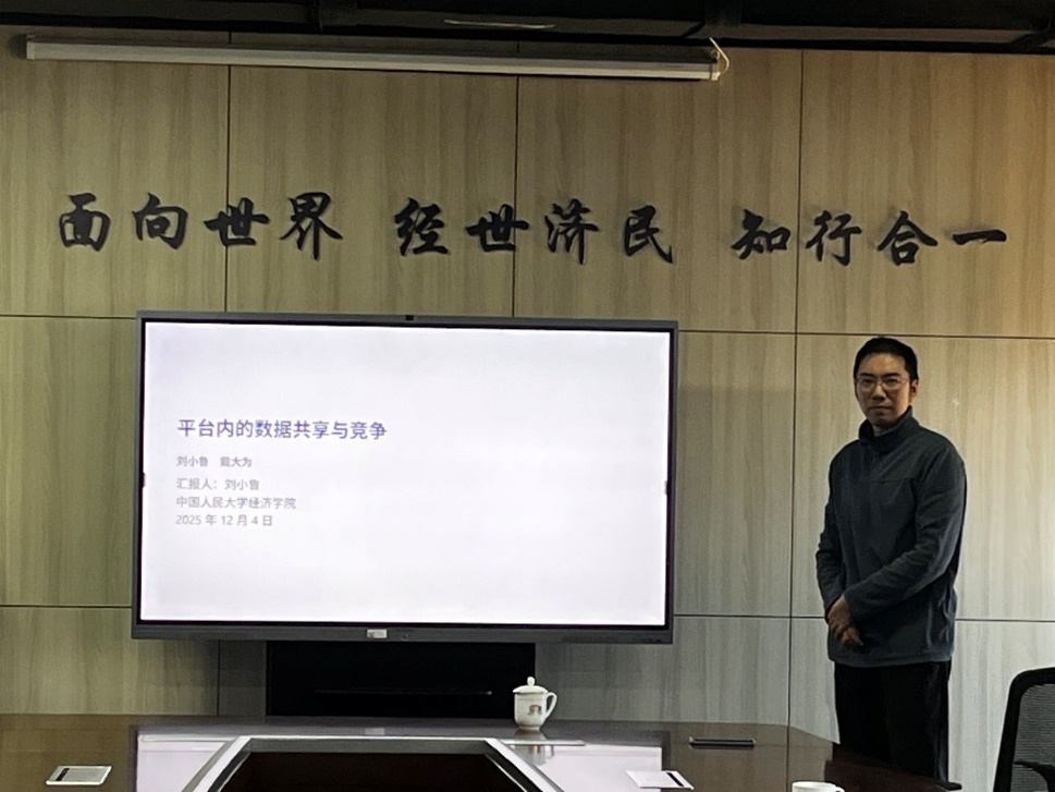 12月4日周四下午,beats365官网亚洲网页版2025年中青年学者讲座在沙河校区公司楼11号楼308会议室举行。此次讲座邀请到beats365刘小鲁教授,分享题为“平台内的数据共享与竞争”的研究。beats365尹振东教授主持讲座,多位老师和员工参加了此次讲座。