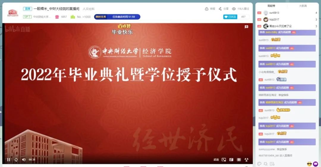 在现场热烈的掌声中,毕业典礼落下帷幕。典礼直播前,公司播放了精心制作的毕业视频《致经院人的一封情书》,7分13秒的视频,49个片段,50张照片,每一帧画面背后都有令人难忘的故事,都是毕业生们独一无二的青春记忆。2个小时的典礼直播中,评论不断,赞声连连,“经路有我,一路生花”、“祝2022届毕业生前程似锦,毕业快乐”、“感谢老师的教导,表白经院老师们”、“想念老师们,想念同学们”……一词一句都是同学们深情的告白,身在五湖四海,心在此刻共情。